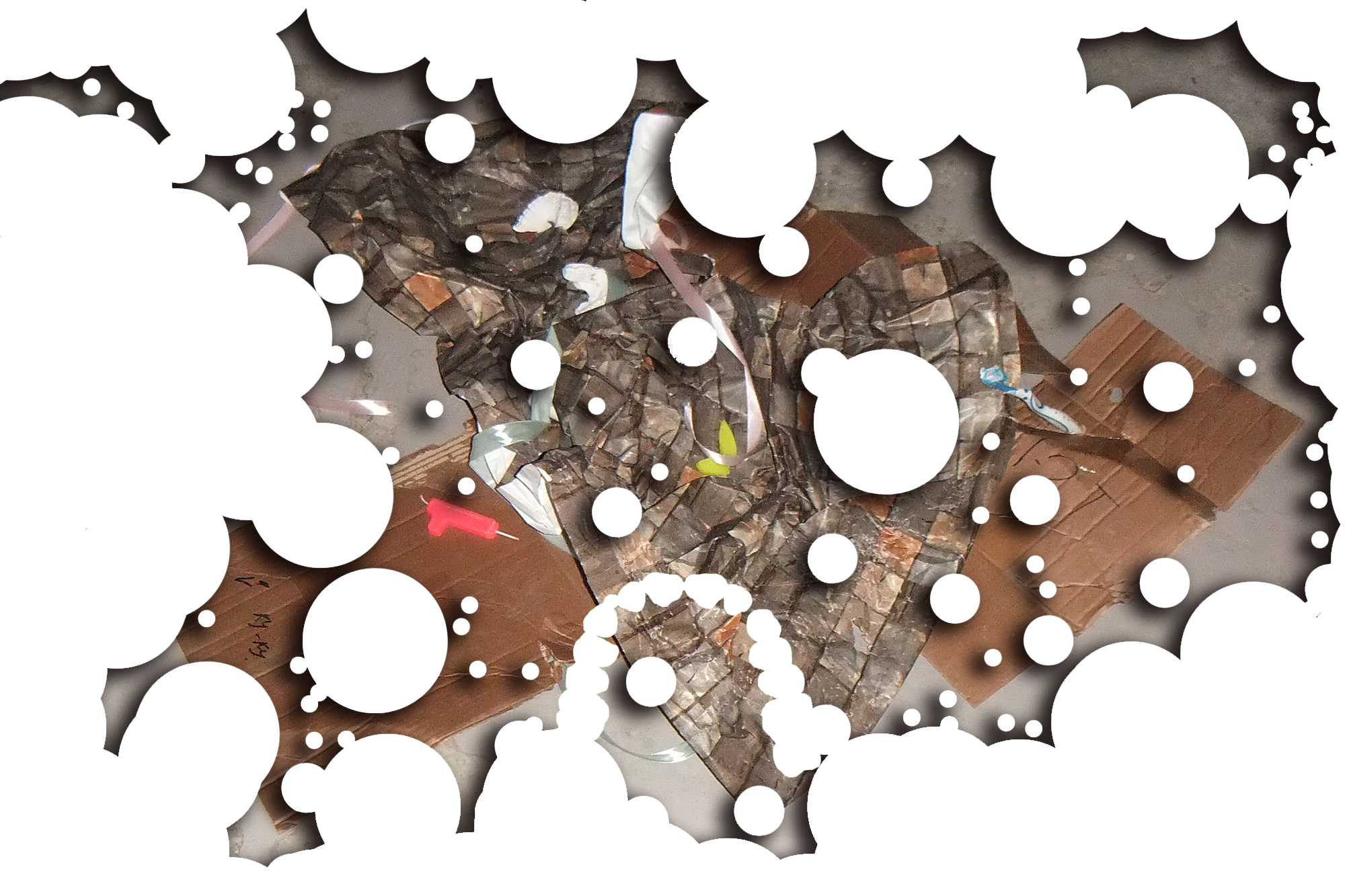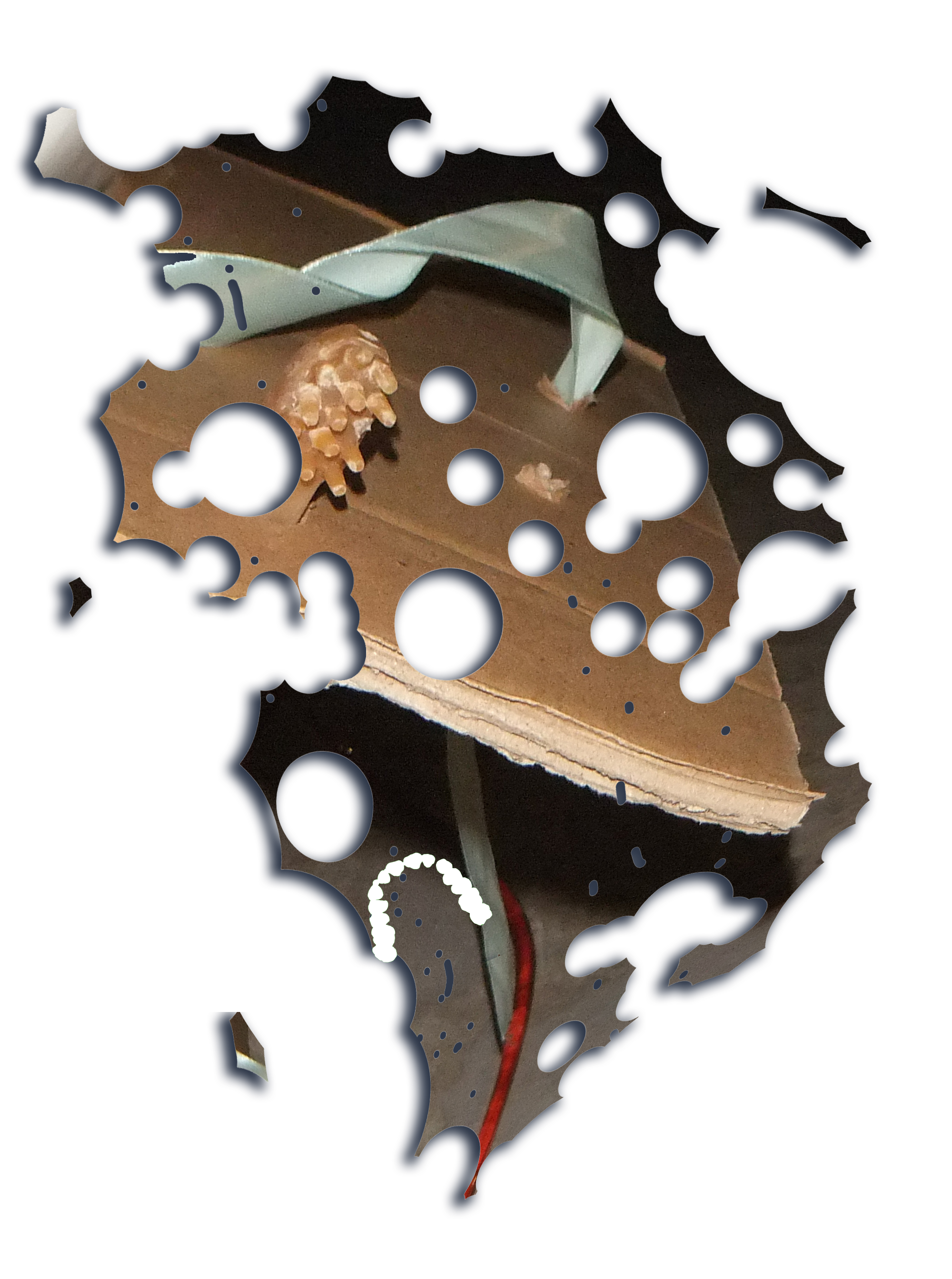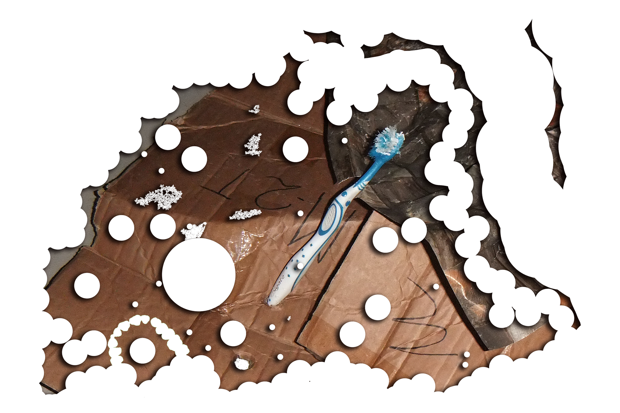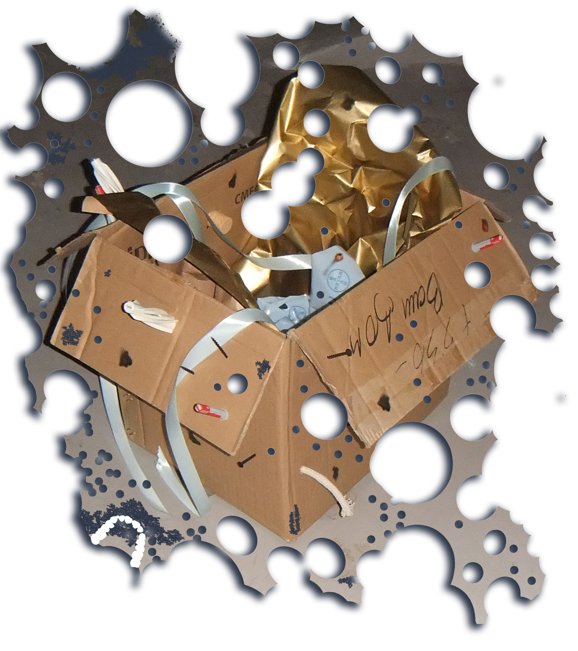 Four cardboard boxes bitten by human, marker on cardboard, gift ribbons, wrapping paper, birthday candles, industrial screws, 3D printed screws (ABS), wall plugs, wall plugs bitten by dog, toothbrush bitten by dog, dog feed bitten by human, stickers, protective plastic of a PET panel, natural cork stoppers, synthetic stoppers, pvc pipes, bulk wine, plaster, 3D images in png, text, Photoshop brush made from human dentures (abr file) and Font (otf file): Untitled Font (perforated version)*