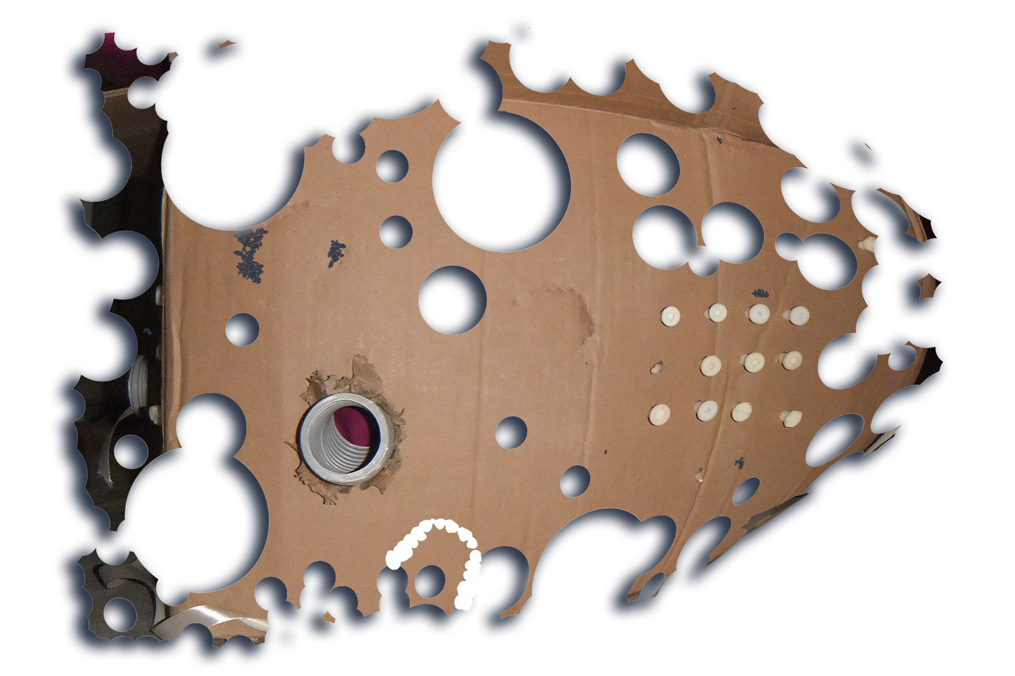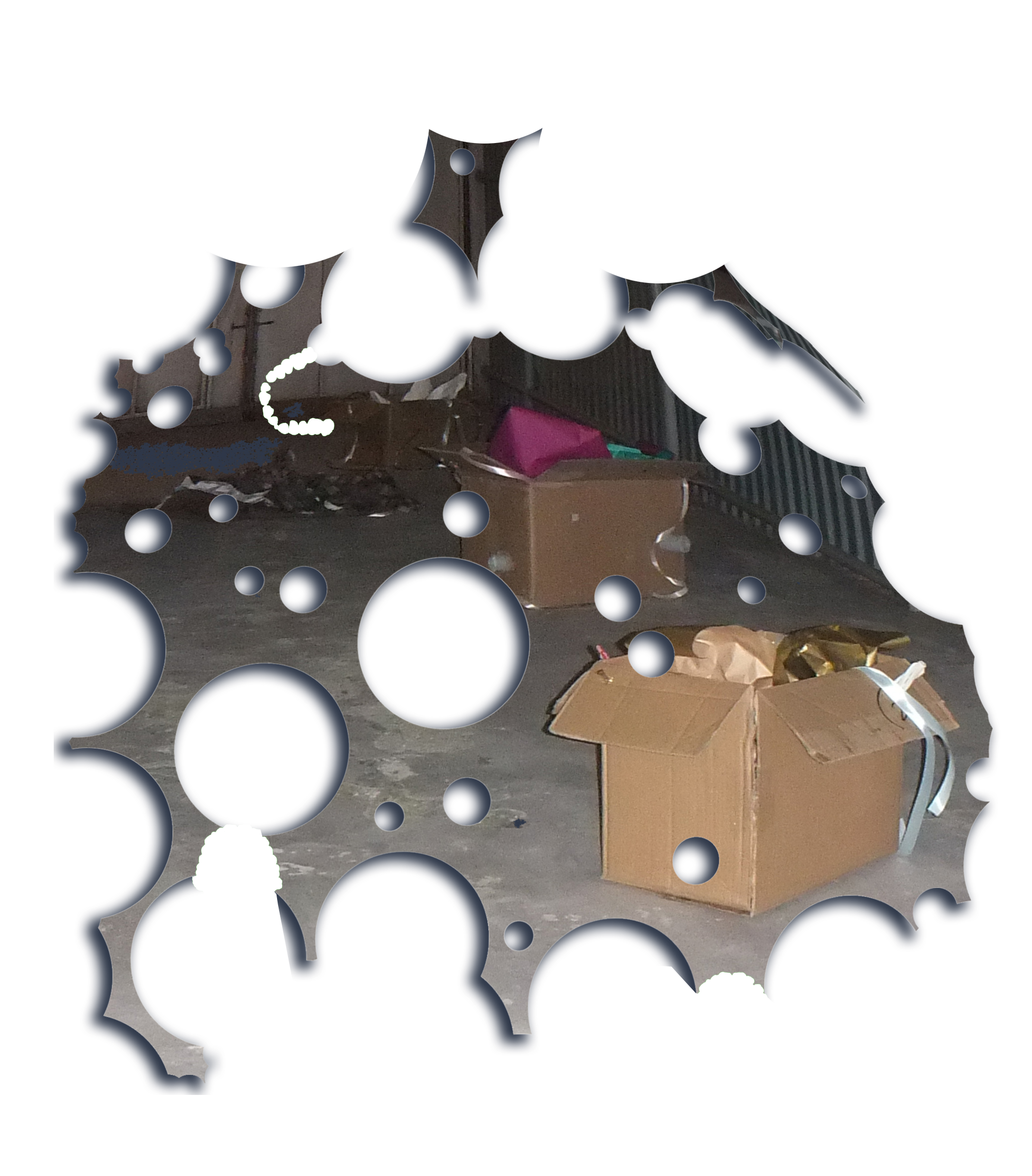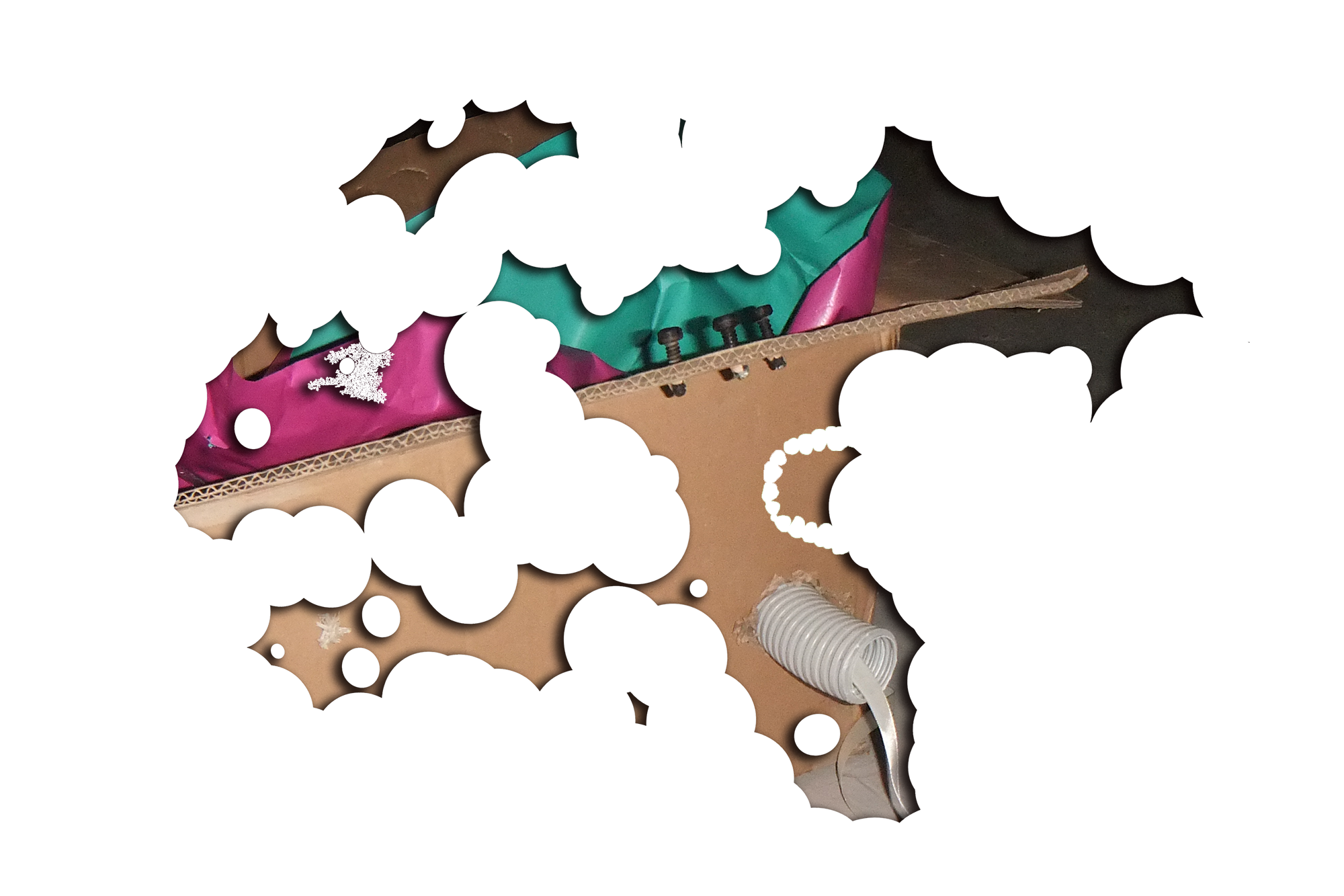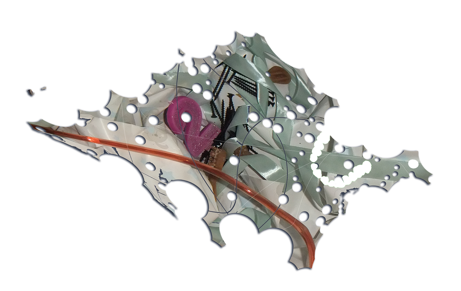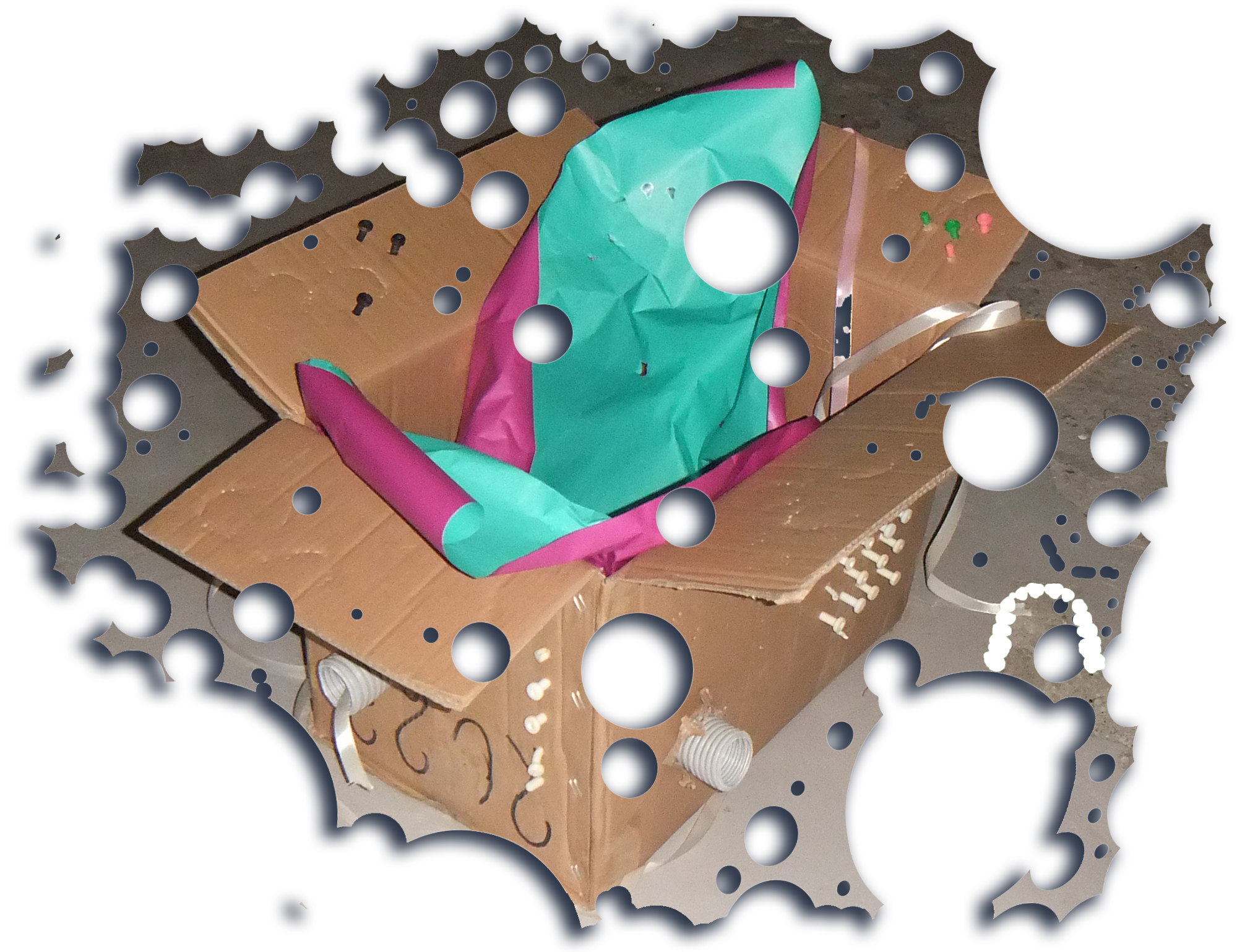 Four cardboard boxes bitten by human, marker on cardboard, gift ribbons, wrapping paper, birthday candles, industrial screws, 3D printed screws (ABS), wall plugs, wall plugs bitten by dog, toothbrush bitten by dog, dog feed bitten by human, stickers, protective plastic of a PET panel, natural cork stoppers, synthetic stoppers, pvc pipes, bulk wine, plaster, 3D images in png, text, Photoshop brush made from human dentures (abr file) and Font (otf file): Untitled Font (perforated version)*